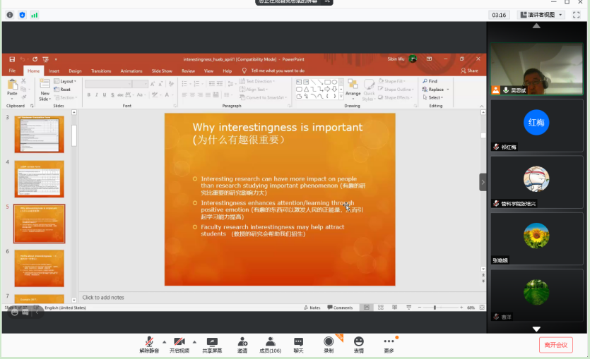 4月1日,应KY开元管理科学与工程学院和科研处邀请,美国德克萨斯大学吴思斌教授通过线上形式,作了题为“追求趣味性:建立文章理论的技巧”的学术报告。报告由管理科学与工程学院院长祁红梅主持,学院教师及研究生100余人聆听了此次讲座。