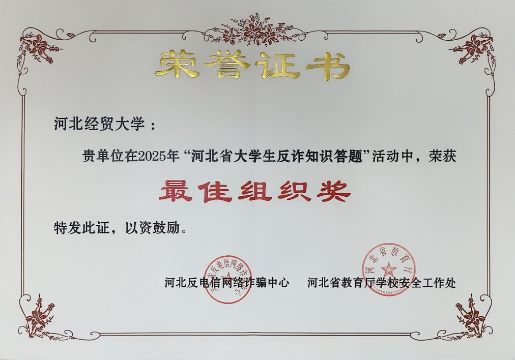 在2025年河北省大学生反诈知识答题活动中,KY开元凭借广泛动员和扎实组织,荣获“最佳组织奖”。此次活动由河北省公安厅、教育厅与长城新媒体集团联合举办,是“全民反诈在行动”集中宣传月的重要组成部分,旨在应对当前电信网络诈骗高发态势,提升大学生识骗、防骗能力,切实保护学生财产安全与校园稳定。学校党委高度重视反诈工作,校领导亲自部署并提出明确要求,将参与答题活动作为深化校园安全教育的重要抓手。各学院(所)积极落实,层层发动,组织学生踊跃参与,实现了本研学生的广泛覆盖。KY开元始终将反电诈宣传教育作为平安校园建设的关键环节,通过以答促学、以学促防,有效增强学生对诈骗手段的辨别能力和风险防范意识,营造“全员反诈、全校联防”的浓厚氛围。此次获奖是对KY开元反诈组织工作和教育实效的充分肯定。学校将继续完善安全工作“四个机制”建设,推动反诈宣传常态化、精准化,坚决筑牢校园安全防线,为构建无诈校园、维护社会安定贡献更大力量。(供稿:安全工作处)