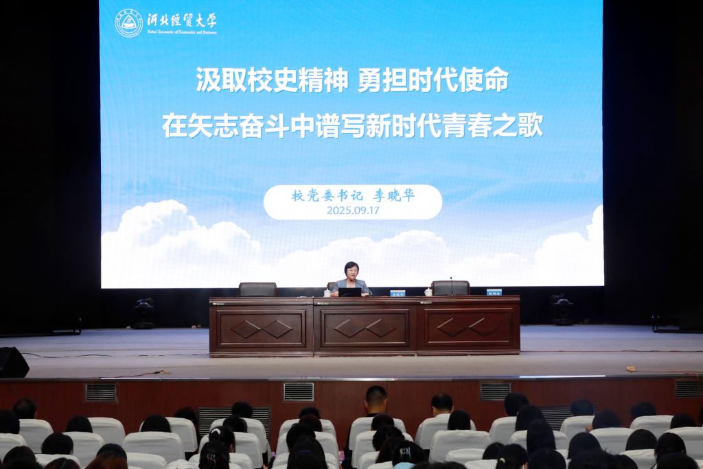 李晓华以“汲取校史精神 勇担时代使命 在矢志奋斗中谱写新时代青春之歌”为题,围绕“回望校史——薪火七秩映初心”“读懂校情——潮头奋楫谱新篇”“做新经贸人——青春筑梦向未来”三个部分,为广大师生讲授了一堂启智润心、生动深刻的思政大课。