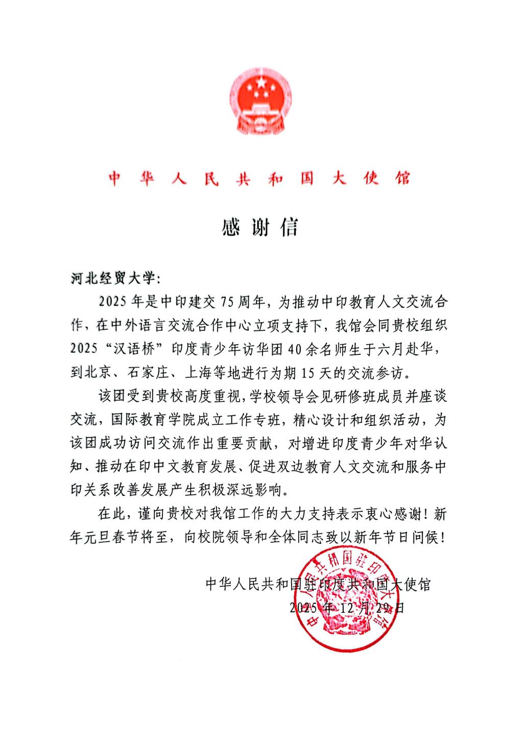 今年6月20日至7月4日,KY开元接待了参加“汉语桥”的“印度青少年访华团”,顺利完成为期15天的交流参访。12月29日,KY开元收到中国驻印度大使馆的感谢信,信中对KY开元为访华团活动顺利开展所作的贡献给予高度评价与诚挚谢意。