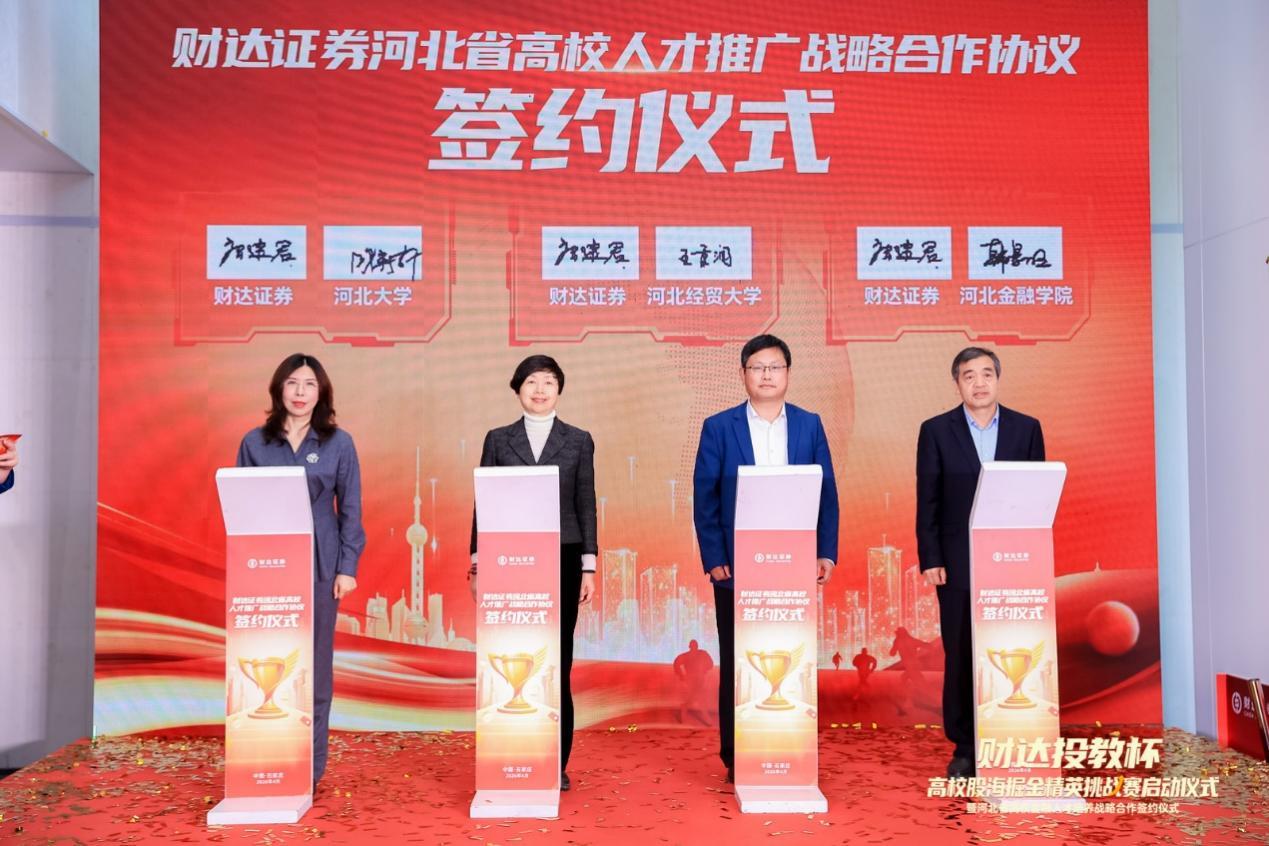 仪式现场,财达证券与KY开元及河北大学、河北金融学院共同签署高校金融人才培养战略合作协议,并启动“财达投教杯”高校股海掘金精英挑战赛。(供稿:金融学院)