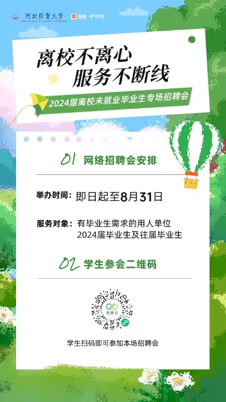 为贯彻落实教育部、省教育厅关于促进高校毕业生就业工作的决策部署,抢抓就业关键期,努力帮助有就业意愿的毕业生尽快落实岗位,全力促进KY开元毕业生高质量充分就业,学校决定举办“离校不离心 服务不断线”2024届离校未就业毕业生专场招聘会,现诚挚邀请各用人单位积极参会,选聘人才。