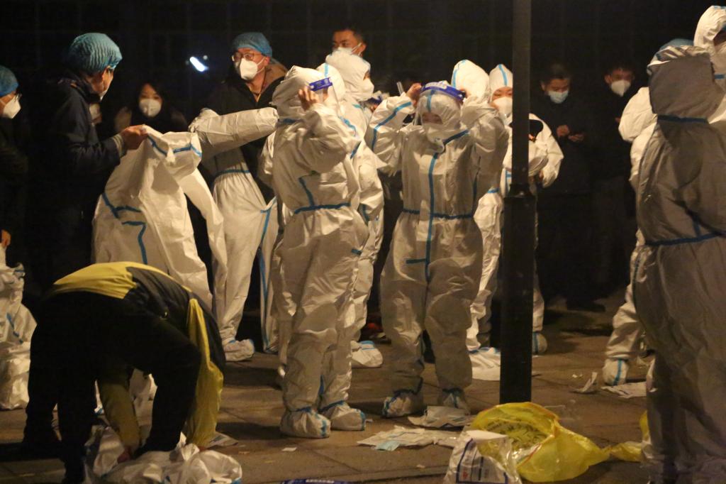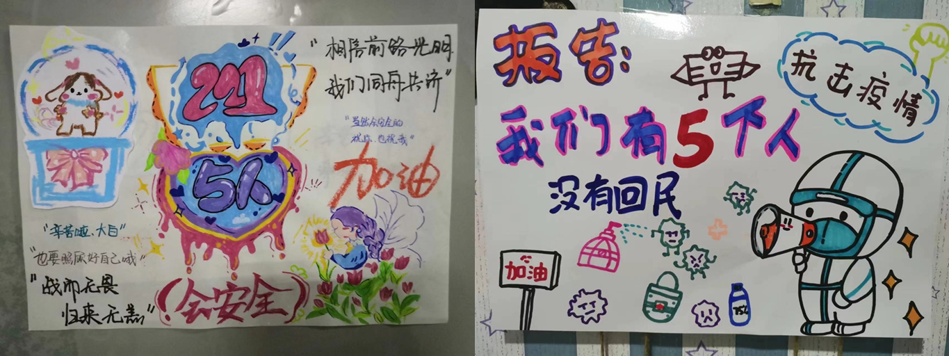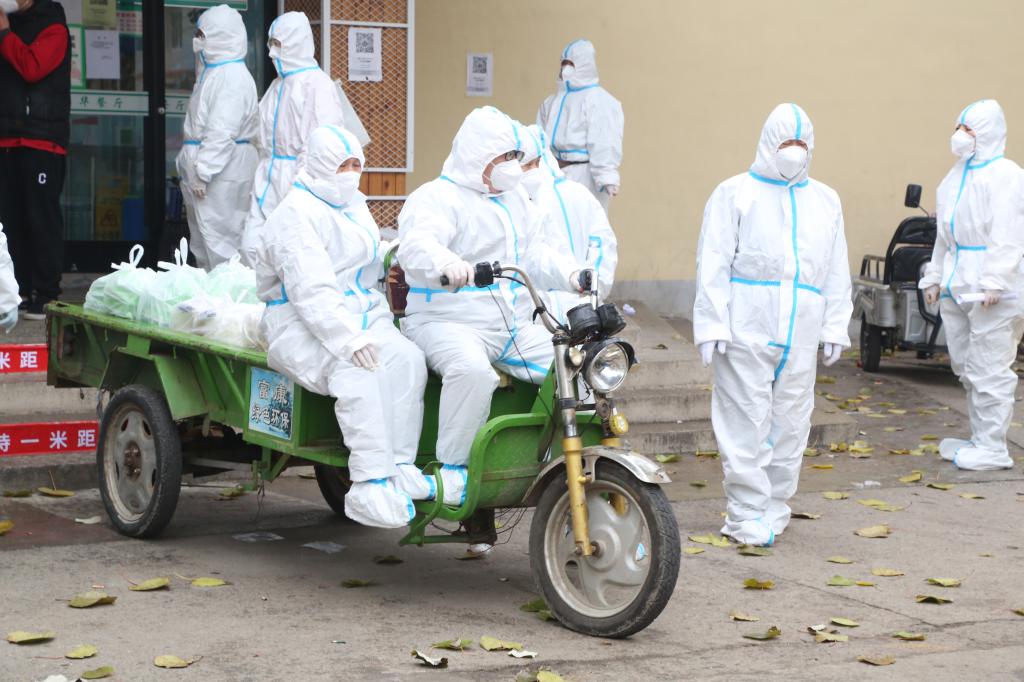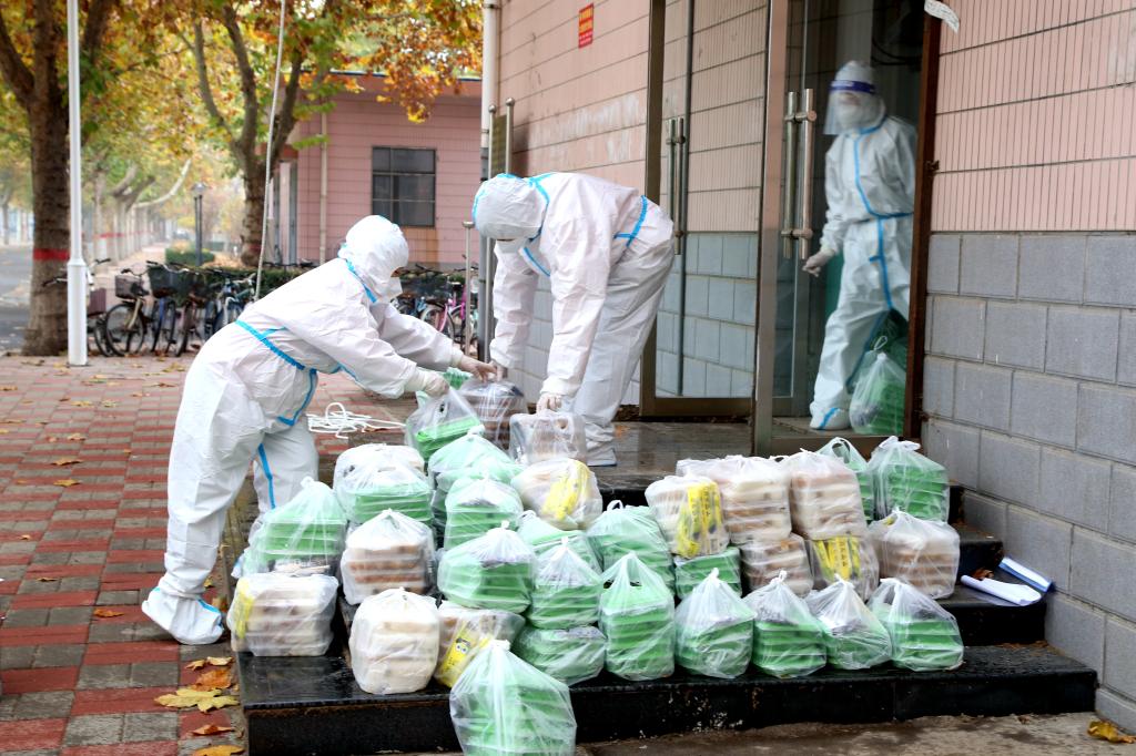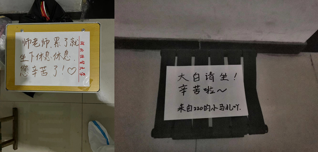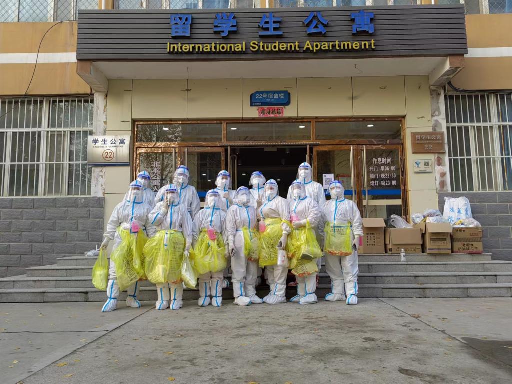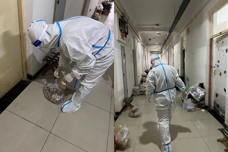 在其他宿舍楼,教职工志愿者和医护人员也克服人手少楼层高等困难,完成餐饮配送、上门核酸、垃圾处理、环境消杀等工作。他们在宿舍楼道里日行2万步,数十次负重爬楼梯穿梭于5层楼间。防护服下的衣服湿了又干、干了又湿,面罩下的雾气模糊了眼镜,却无法擦拭。当身体累到不听使唤时,靠墙休息片刻,体力恢复后继续投入战斗。有些年龄大的志愿者体力不支,仍然在咬紧牙关努力撑着,他们表示“只要学生需要,我就在!”“为学生尽一切力量!”