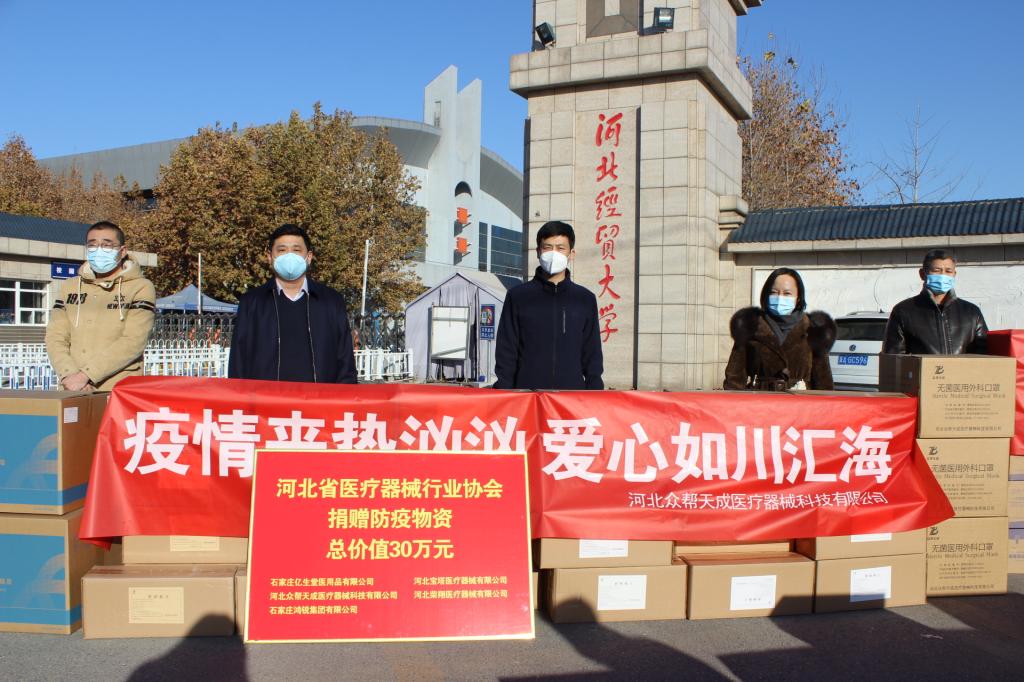 桃李芬芳,爱心回馈。学校疫情时刻牵动着广大校友的心,他们迅速行动,为母校防疫工作捐赠物资。“经贸桥”校友会负责人张晓军组织校友力量,分四批向学校捐赠了医用手套、测温枪、消毒液、喷壶等大量防疫物资,价值42万余元,其中1988级工经系国企管专业校友、石家庄亿生堂医用品有限公司负责人刘胜军联合马忠华、赵荣辉、杨万杰、杨希等其他医疗器械企业负责人,共捐赠价值30万元防疫物资;2005届信息技术学院校友丁江涛、贾志锋代表河北华一智慧城市科技有限公司捐赠防护服、免洗手凝胶、隔离面罩、N95口罩等防疫物资,价值6万余元;2002届法学院校友田景代表河北银行高新支行捐赠720套防护服,价值2万元;2012届金融学院校友于雅雯捐赠价值7000余元的防疫物资。校友们表示,在母校求学的日子终身难忘,永远感恩母校的培养,希望自己和其他校友的捐赠能为学校战胜疫情提供必要的支撑。