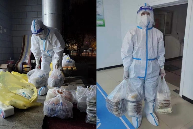在抗疫一线,宿舍楼的楼层长是最辛苦、最危险的岗位之一。贾晶晶担任的是第8栋宿舍楼的层长,韩凯凯先后担任23栋和3栋的层长。数据摸排统计,物品清点消毒,一日三餐派送、防护用品以及基本生活用品派发、垃圾清理都需要层长肩扛手提来完成,同时还要关注学生思想动态、关注学生学习情况,搜集整理学生诉求,安抚情绪、解决困难,工作起来不分昼夜。身穿密不透风的防护服,克服呼吸不畅和雾气遮挡视线等困难,来来回回的上楼下楼,不断重复的弯腰起身……每次脱下防护服时,都会发现衣服已被汗水浸透。