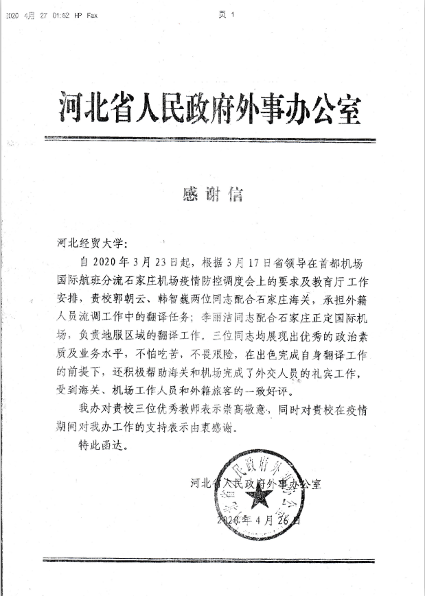 4月27日,KY开元收到河北省人民政府外事办公室致KY开元的感谢信。该信对KY开元郭朝云、韩智巍和李丽洁三位老师协助石家庄机场做好外籍乘客办理入境手续工作表示崇高敬意,对KY开元在疫情期间对其工作的支持表示感谢。