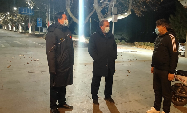 在校医院,董兆伟向一线医护人员表示敬意,并详细询问了防疫物资储备、就诊服务、核酸检测等工作情况,叮嘱大家在做好个人防护同时,备足防疫药品、防具等医用物资,坚守岗位、尽职尽责,为广大师生的生命安全和身体健康保驾护航。在门卫执勤点,董兆伟对安全工作处同志们坚决落实疫情防控工作要求,确保疫情防控关键时期校园安全稳定表示感谢。他强调,要进一步提高认识、压实责任,严格按照“六个一律”要求,加强校园安全管控,强化校园巡逻制度,将疫情防控工作要求落地落实落细,确保校园安全稳定。他要求学校相关部门要加强物资供应,把做好疫情防控工作人员和留校师生的生活保障作为重要任务抓紧抓实,为他们提供安全舒适的生活环境。