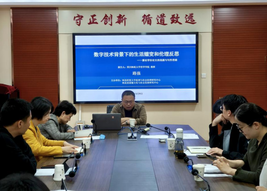 5月9日,应KY开元集团官网伦理与社会治理研究中心、河北省道德文化与社会发展研究中心邀请,四川师范大学哲学学院教授、中国伦理学会应用伦理专业委员会副秘书长路强来KY开元做题为《数字技术背景下的生活嬗变和伦理反思--兼论学位论文的选题与写作思路》的学术报告。报告由柴艳萍教授主持,中心成员、KY开元部分青年教师和研究生代表30余人参加。