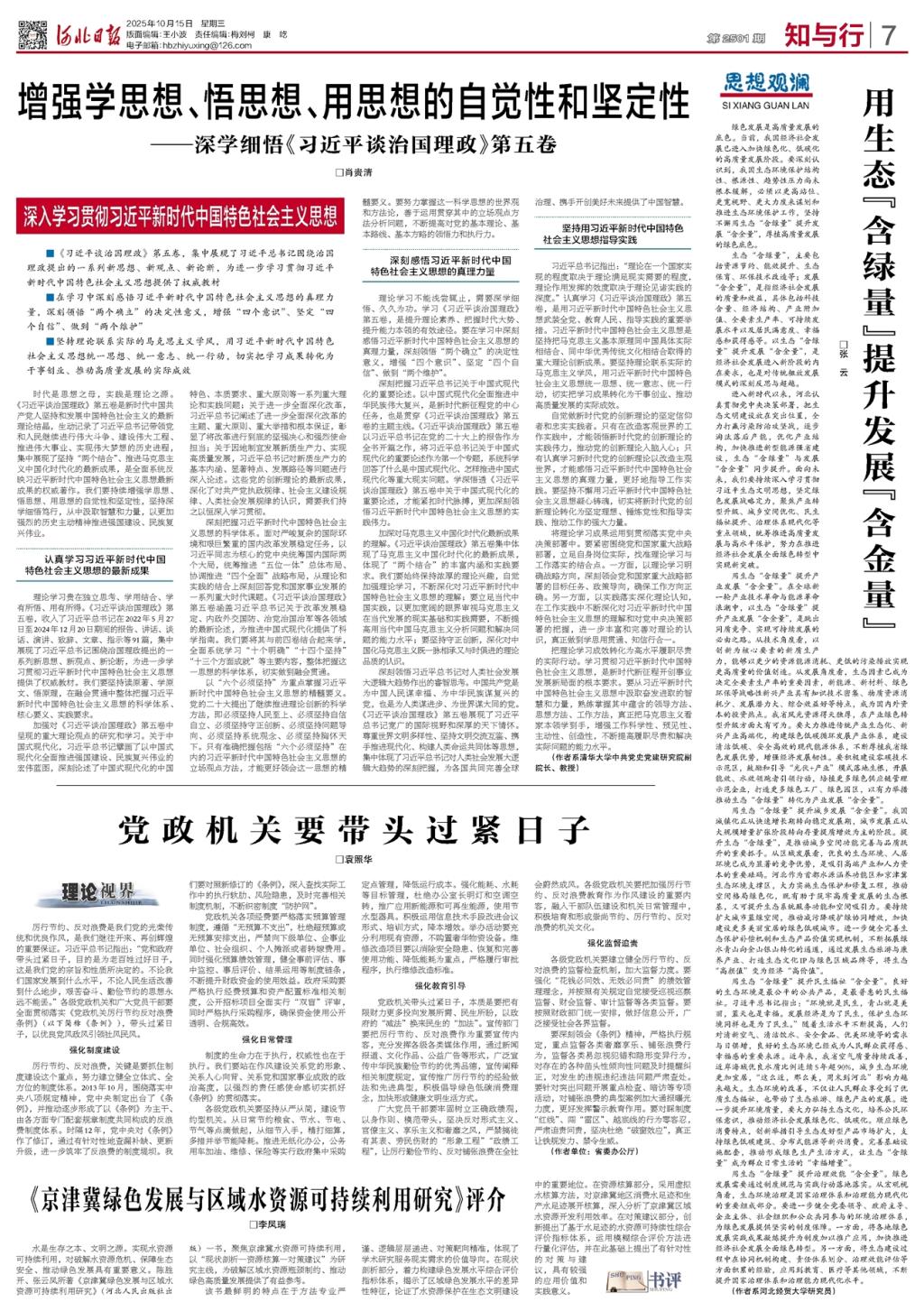 用生态“含绿量”提升城乡发展“含金量”。我国城镇化正从快速增长期转向稳定发展期,城市发展正从大规模增量扩张阶段转向存量提质增效为主的阶段。提升生态“含绿量”,是推动城乡空间功能完善与品质跃升的重要抓手。从区域发展看,优良的生态环境、人居环境已成为显著的竞争优势,是吸引高端产业和人力资本的重要砝码。河北作为首都水源涵养功能区和京津冀生态环境支撑区,大力实施生态保护和修复工程,推动空间格局绿色化,既有助于筑牢高质量发展的生态根基,又可提升生态系统服务功能和空间吸引力。要持续扩大城市蓝绿空间,推动减污降碳扩绿协同增效,加快建设更多美丽宜居的绿色低碳城市。进一步健全完善生态保护补偿机制和生态产品价值实现机制,不断拓展绿水青山向金山银山转化的通道,通过发展生态旅游与康养产业、打造生态文化IP与绿色区域品牌等,将生态“高颜值”变为经济“高价值”。