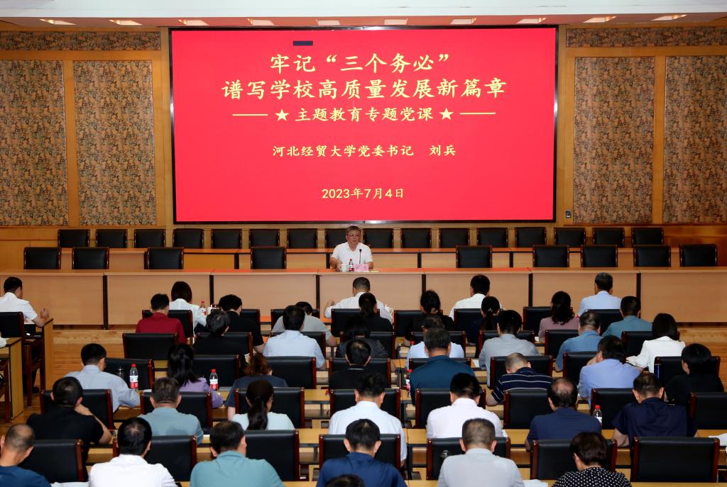 刘兵指出,党的十八大以来习近平总书记先后10次视察河北,发表了一系列重要讲话和重要指示,其中蕴含着“六个坚持”的立场观点方法,彰显着“三个务必”的价值导向,闪烁着时代的思想光芒,为河北事业发展指明了前进方向,提供了根本遵循。我们要始终坚持以习近平新时代中国特色社会主义思想为指导,深入贯彻落实习近平总书记关于高等教育的重要论述,牢牢把握“三个务必”的核心要义,把党中央和省委的重大决策部署落到实处,锚定建设国内知名的高水平财经大学目标奋勇前进,为加快建设经济强省、美丽河北,奋力谱写中国式现代化建设河北篇章贡献经贸力量。(撰稿/摄影:段盛杰)